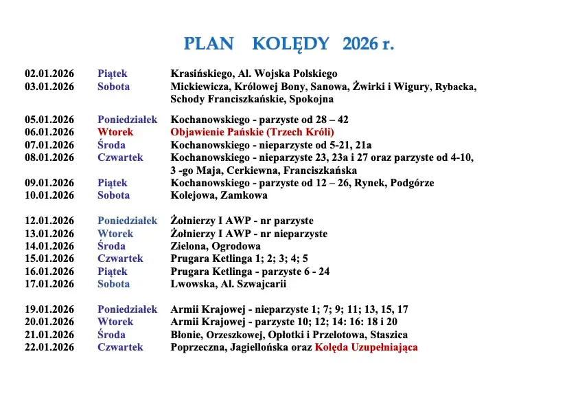 Plan Wizyty Duszpasterskiej na styczeń 2026 roku w parafii Podwyższenia Krzyża Świętego w Sanoka.